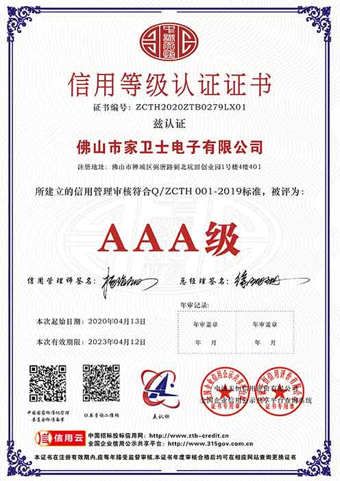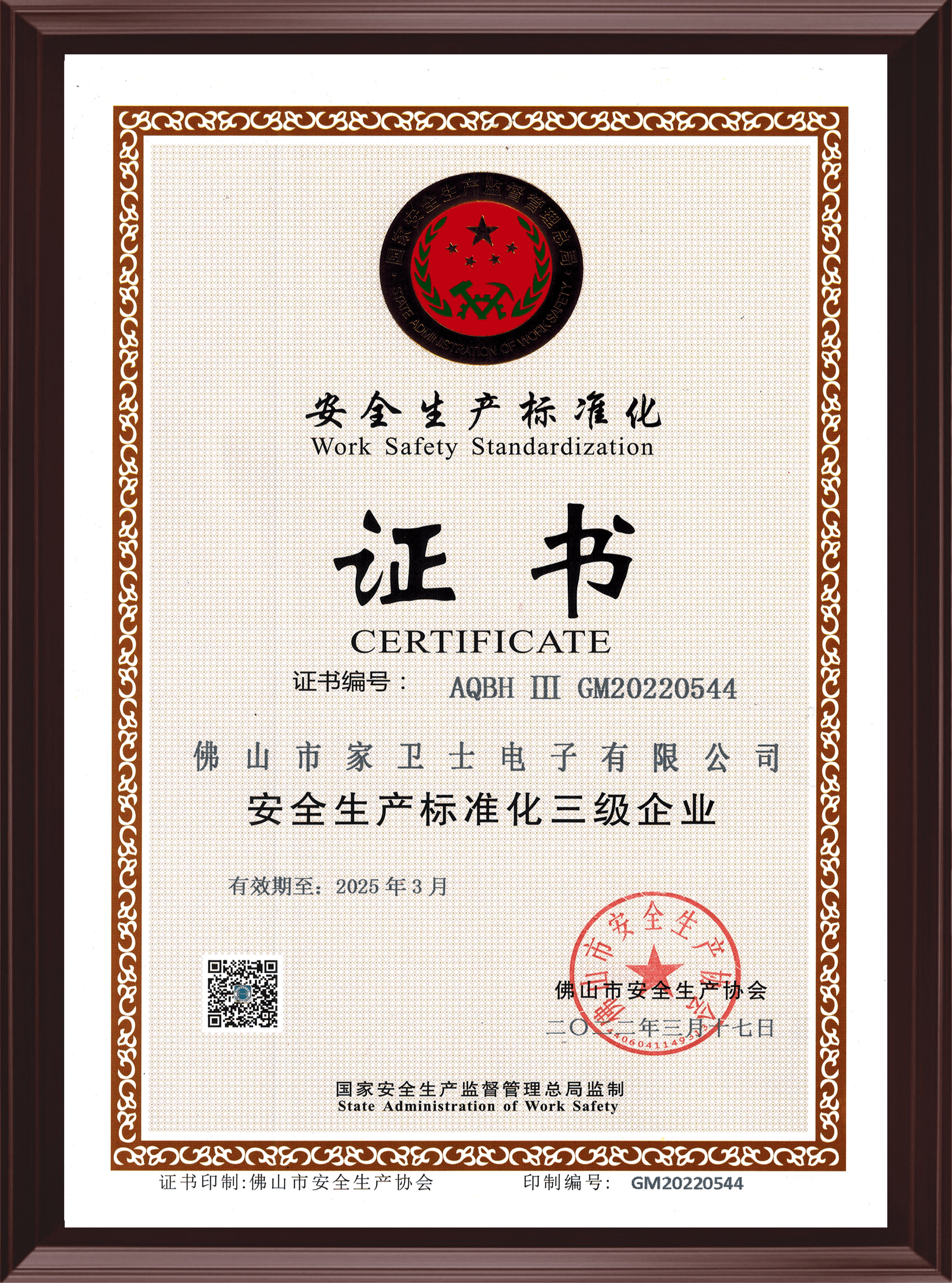 自成立以来,家卫士在不断发展,相继推出一系列功能齐全、科技含量高的产品,并荣获“广东省守合同重信用企业”、“安全生产标准化三级企业”、“三星品牌认证”、“ISO9001认证”、“ISO14000认证”、“RoSH认证”、“ CE认证”等证书。公司拥有超过十余年的自主研发基地、全自动化生产线及完整的品质监控检测系统。此外,公司还拥有楼宇对讲2项发明专利和8项实用型专利,指纹锁4项外观设计专利和7项新型实用专利,被评为“高新技术企业”。