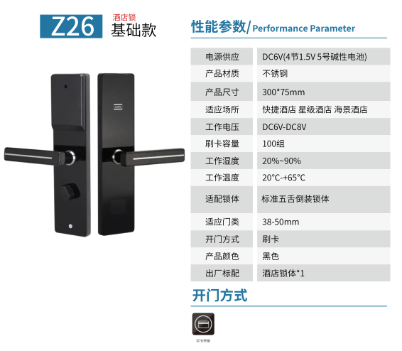 - 开锁方式:刷卡、机械钥匙、TTHOTEL APP、TTLOCK APP